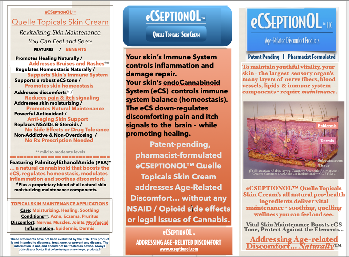 Your skin’s Immune System controls inflammation and damage repair. Your skin’s endoCannabinoid System (eCS) controls immune system balance (homeostasis). This is the basis for your body to regulate discomforting pain and itch as it signals to your brain all the while promoting healing.